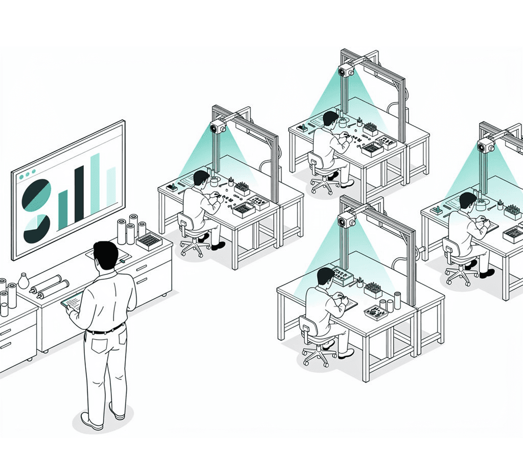 Cameras mounted above workstations continuously capture every assembly cycle, generating thousands of data points per minute. Installation takes 1-2 days with minimal disruption to production.