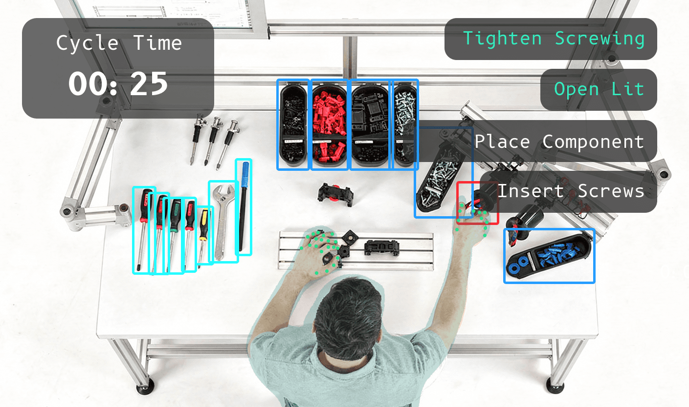 The system tracks hands and tools in real-time, automatically measures cycle times, identifies completed work steps, and flags deviations from standard sequences—generating insights without manual data entry.